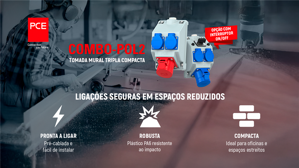 A nova tomada mural tripla COMBO-POL2 da PCE oferece uma solução prática e robusta para ligações elétricas seguras, mesmo em espaços reduzidos.