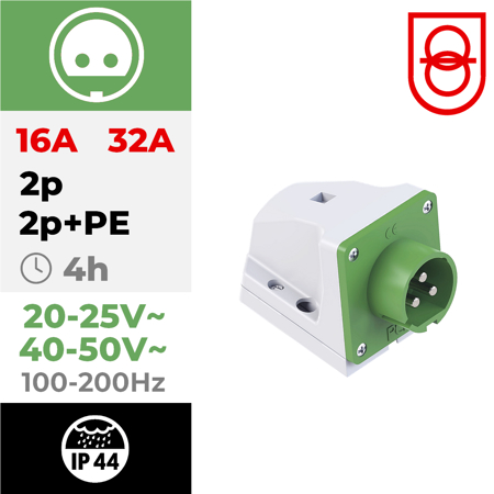 Tomada mural macho IP44 32A 2P+T 24/42V 100/200Hz 4h