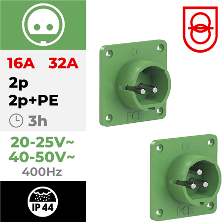 Tomada encastrar macho IP44 32A 2P+T 24/42V 400Hz 3h