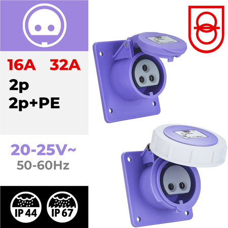 Tomada encastrar fêmea IP44 32A 2P 24V