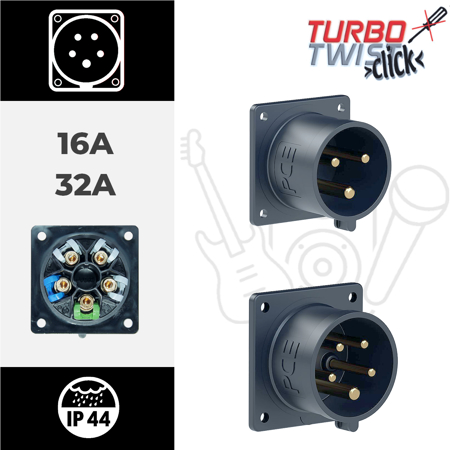 Tomada encastrar macho preta IP44 32A 3P+T+N 400V aperto p/ mola