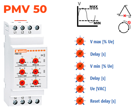 Relé mín V + máx V + seq + falta de fase 3F, 1CO, 380-575V~
